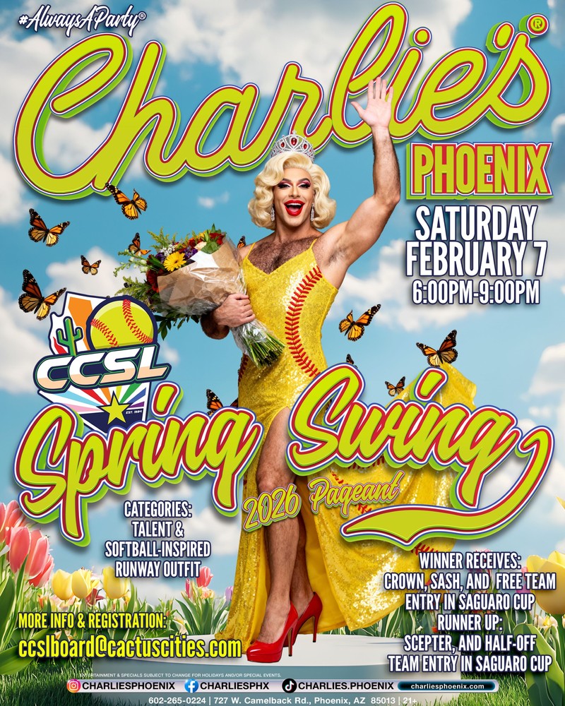CCSL is gearing up for a night where cleats meet couture and softball swagger collides with full-throttle drag excellence. The Cactus Cities Softball League, alongside Premier Sponsor Charlie’s Phoenix, has officially announced the CCSL Spring Swing ’26 Pageant — one of a kind event blending athletic spirit with drag fun!